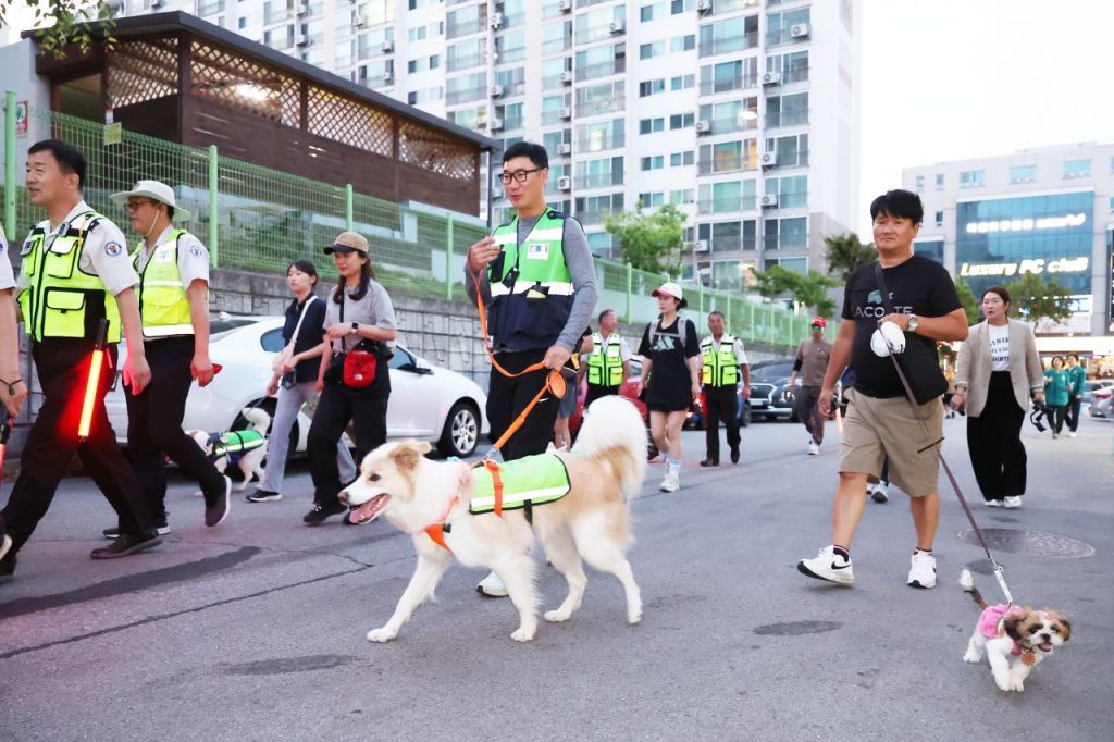 원주시 반려견순찰대 20개 팀을 비롯한 시민 300여명이 11일 저녁, 자율방법 합동순찰대와 지역 내 안전 사각지대 점검과 안전한 반려견 문화 캠페인 활동을 펼쳤다. 사진=원주시청 제공