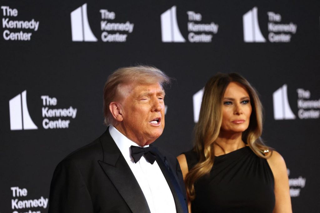 도널드 트럼프 미국 대통령과 영부인 멜라니아 트럼프 여사가 11일(현지시간) 워싱턴 케네디센터에서 영화 '레미제라블' 관람에 앞서 취재진과 이야기를 나누고 있다. / AFP·연합뉴스