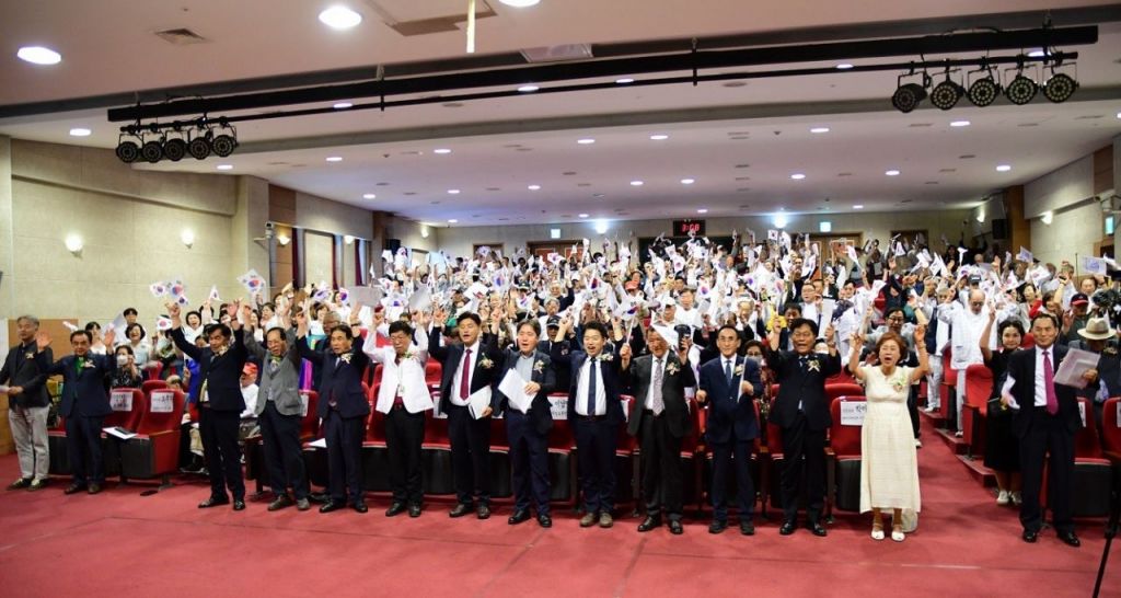부산지방보훈청 41회 국가유공자 나라사랑 기도회 참석자를이 만세삼창을 외치고 있다. 부산지방보훈청 제공