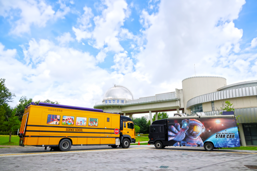 국립광주과학관의 이동식 과학차량 ‘사이언스 스쿨버스’와 ‘스타카’. 광주과학관 제공