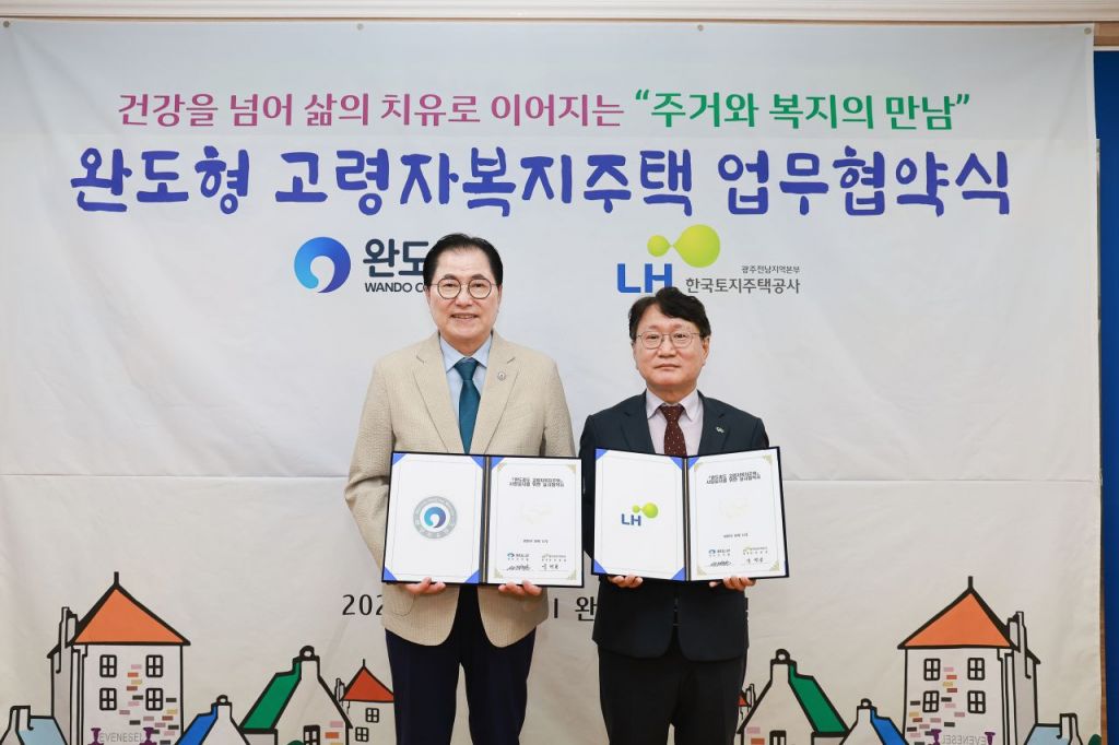전남 완도군이 지난 11일 군청에서 한국토지주택공사(LH) 광주전남지역본부와 '완도 중도 고령자 복지 주택 건설 사업'의 원활한 추진을 위한 업무협약을 체결했다.