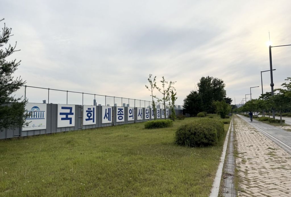 세종특별자치시 세종동 국가상징구역 일대에 조성된 국회세종의사당 부지 모습. 길게 뻗은 도로를 따라 회색 벽이 길게 설치돼 있다. 자전거를 타고 이동하는 몇몇 사람 외에는 인적이 드물어 휑한 분위기를 자아낸다. 김평화 기자