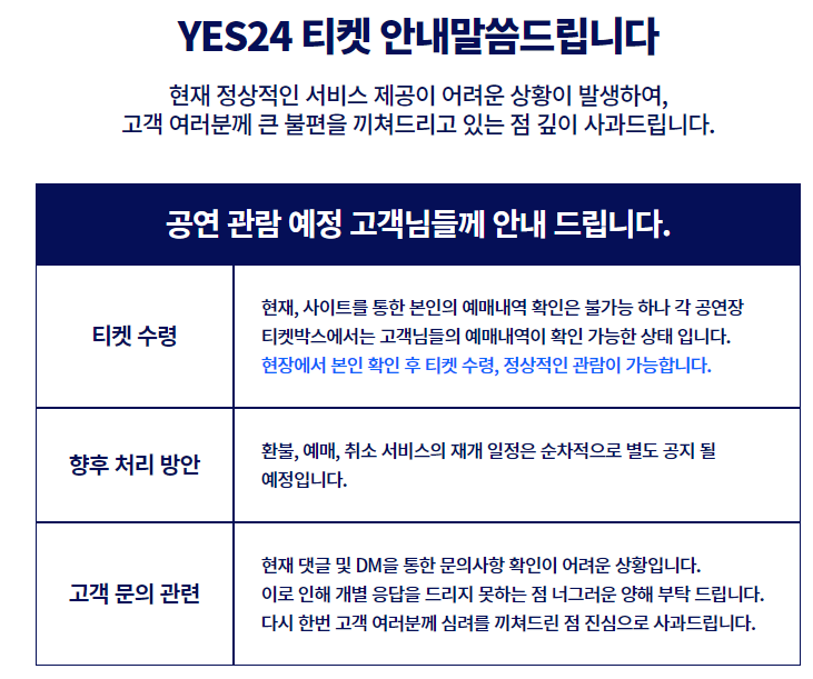 12일 예스24는 '예스24티켓' 홈페이지를 통해 현장에서 본인 확인 후 티켓 수령이 가능하다고 공지했다. "현재 사이트를 통한 본인의 예매내역 확인은 불가능 하나 각 공연장 티켓박스에서는 고객님들의 예매내역이 확인 가능한 상태"라고 안내했다.