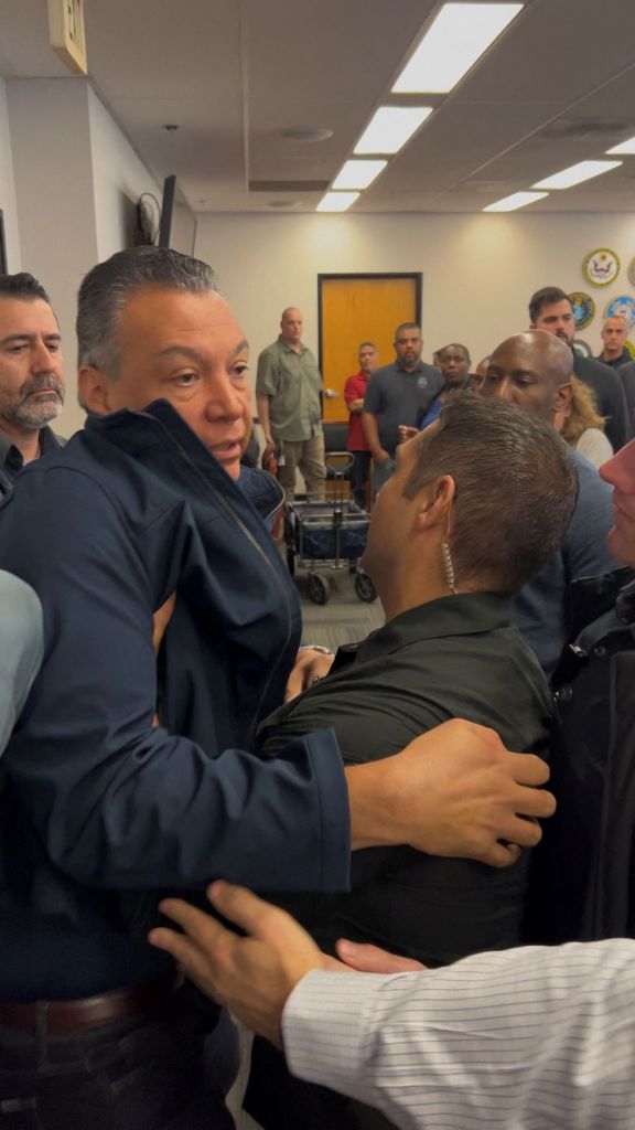 알렉스 파디야(민주·캘리포니아) 연방 상원의원이 12일(현지시간) 오전 열린 크리스티 놈 국토안보부 장관의 LA 시위 관련 기자회견장에서 쫓겨나고 있다. AFP연합뉴스