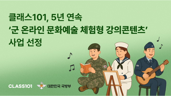 클래스101은 국방부가 주관하는 '2025 군 온라인 문화예술 체험형 강의콘텐츠' 사업 운영사로 5년 연속 선정됐다고 13일 밝혔다. 이번 사업은 군 장병 및 군무원 1만2000명을 대상으로 문화예술 분야 온라인 강의를 공급하는 것이다.