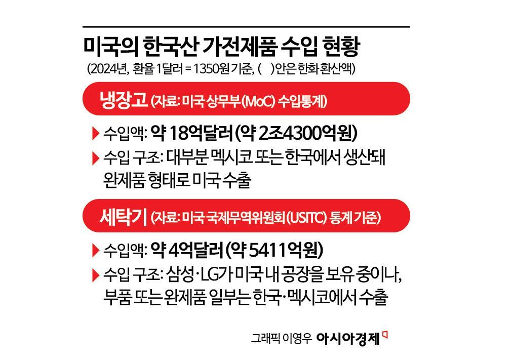 미국 국제무역위원회(USITC)에 따르면 2024년 한국산 세탁기의 대미 수입액은 약 4억790만달러(약 5511억원)였다. 냉장고의 경우 미국 상무부 통계 기준으로 같은 해 한국산 수입액은 약 18억달러(약 2조4300억원)로 추산된다. 두 품목 모두 미국 내에서 한국 제품의 시장 비중이 높은 편으로, 업계는 이번 고율 관세 조치로 인한 수출 타격이 불가피할 것으로 보고 있다.