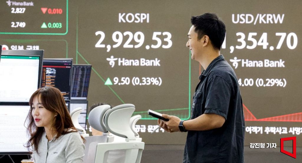코스피가 8거래일 연속 상승세를 이어가고 있는 13일 서울 중구 하나은행 본점 딜링룸에서 딜러들이 업무를 보고 있다.
