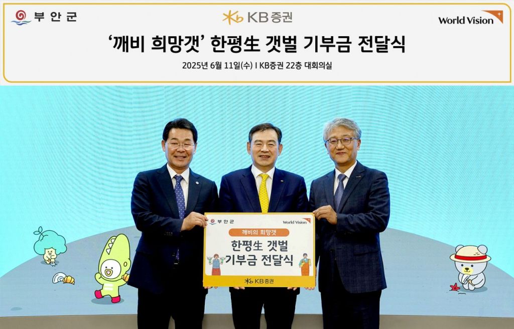 지난 11일 KB증권 여의도 본사에서 ‘깨비의 희망갯, 한평生 갯벌’ 기부금 전달식을 진행하며 KB증권 김성현 대표이사(가운데)와 권익현 전라북도 부안군수, 월드비전 나윤철 나눔사업부문장이 기념 촬영을 진행하고 있다. KB증권