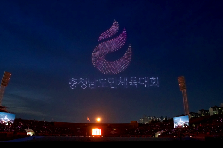 12일 제77회 충남도민체육대회 개회식에서 드론라이트쇼가 진행 중이다.
