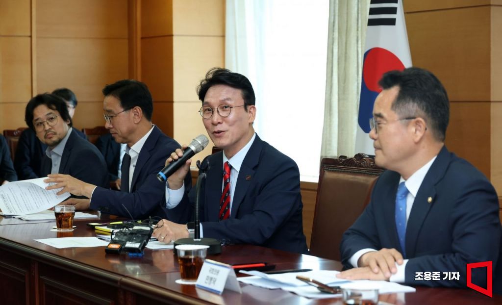 김민석 국무총리 후보자가 13일 서울 종로구 통의동 금융감독연수원에 마련된 청문회 준비단 사무실에서 열린 밥상물가 안정을 위한 경청 간담회에서 발언하고 있다.