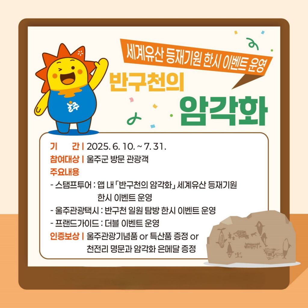 울주군 관계자는 "이번 이벤트를 통해 반구천의 암각화 세계유산 등재 염원을 널리 알리고 울주 고유의 문화유산과 자연 자원을 즐길 기회를 마련했다"며 "더 많은 관광객이 울주를 찾을 수 있도록 적극 홍보에 나서겠다"고 말했다.