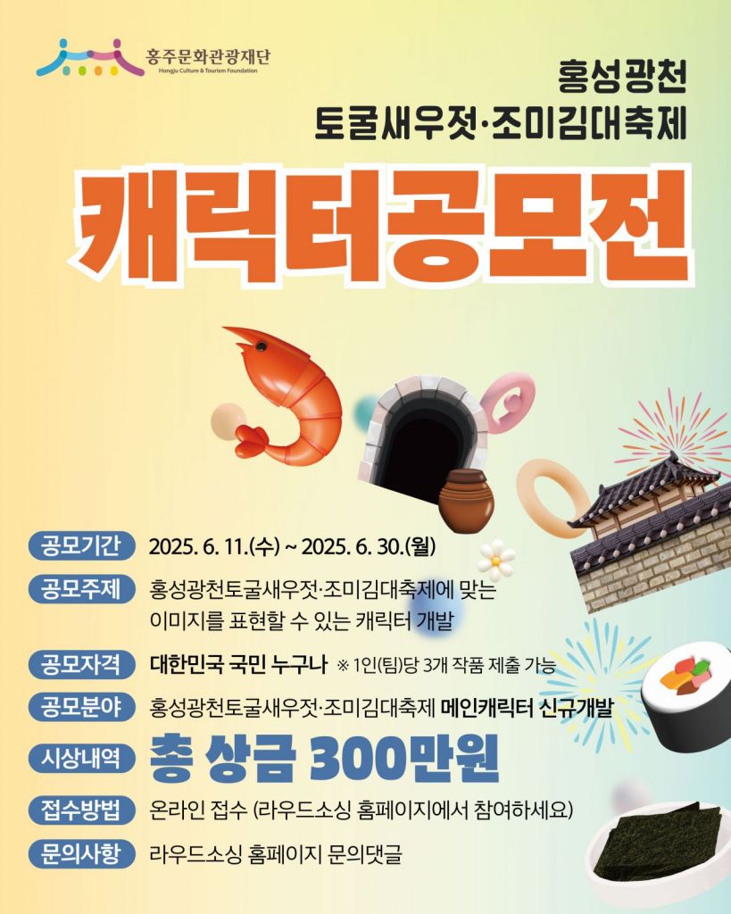충남 홍성군 홍주문화관광재단은 군 대표 축제 중 하나인 광천토굴새우젓·조미김 대축제 홍보에 활용하기 위한 '캐릭터 공모전'을 개최한다고 밝혔다.