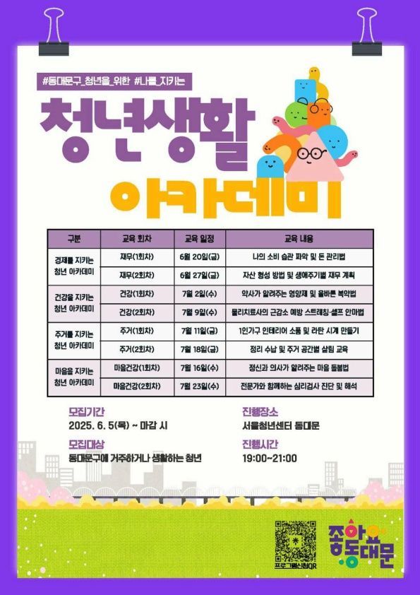서울 동대문구는 지역 청년들의 삶의 질 향상과 자립 역량 강화를 위해 실전형 맞춤 교육 프로그램 ‘2025 청년생활 아카데미’를 이달 20일부터 7월 23일까지 총 8회에 걸쳐 운영한다