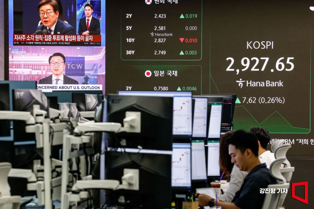 코스피가 8거래일 연속 상승세를 이어가고 있는 13일 서울 중구 하나은행 본점 딜링룸에서 딜러들이 업무를 보고 있다. 2025.6.13. 강진형 기자