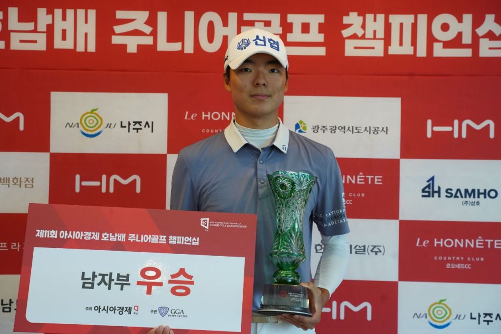 제11회 아시아경제호남배 주니어 골프 챔피언십 남자부 1위에 오른 상현준(대구 경신고 2)이 13일 시상식에서 트로피를 받고 기념 촬영을 하고 있다. 송보현 기자