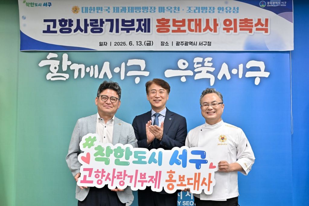 광주광역시 서구가 13일 고향사랑기부제 활성화를 위해 안유성(조리 분야)·마옥천(제과·제빵) 대한민국 명장을 고향사랑기부제 홍보대사로 위촉하고 기부금 모금에 활력을 더할 계획이다.