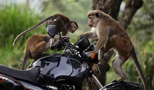 토크 마카크 원숭이가 오토바이에서 장난을 치고 있다. EPA 연합뉴스