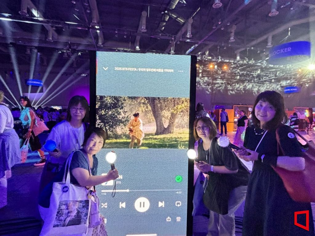 행사장에 들어서니 초대형 '아미밤(응원봉)'이 눈길을 붙잡았다. 매시 정각 5분간 펼쳐지는 라이트 쇼는 인기 포토존으로, 팬들은 아미밤을 들고 인증샷을 남기기 바빴다.
