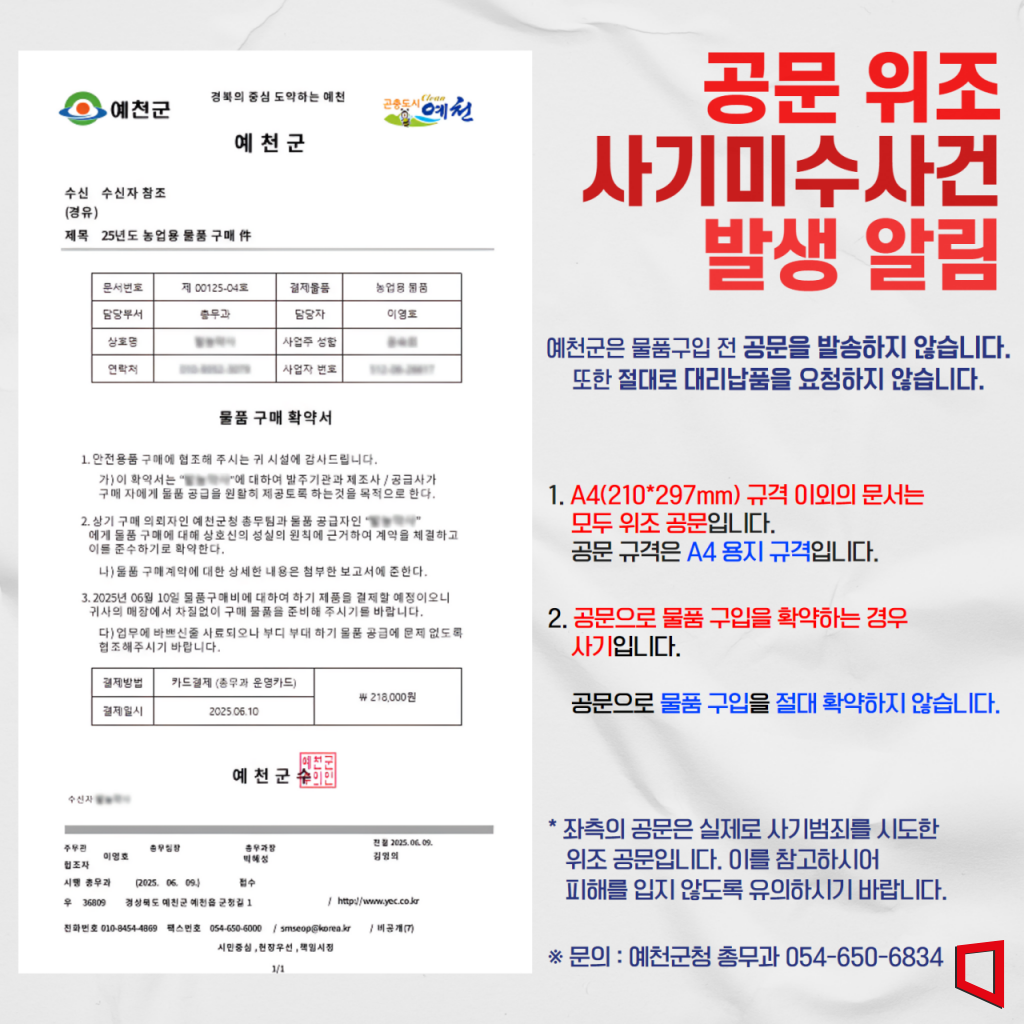 예천군 관계자는 ▲ 공문은 반드시 A4 규격으로 작성되어야 하며, 다른 크기의 문서는 확인 필요 ▲ 공문 하단의 담당자 전화번호가 예천군청 국번이 아닌 휴대전화 또는 인터넷 전화로 표기된 경우 의심 ▲ 공무원이 특정 업체의 제품을 대신 구매해달라고 요청하는 경우, 사기 가능성 높다고 강조했다.