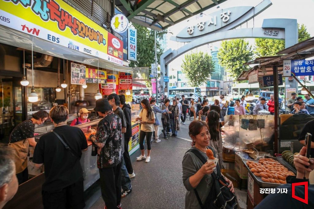 서울 종로구 광장시장에 자리한 유명 꽈배기 상점을 찾은 외국인 관광객들이 꽈배기를 구입하기 위해 줄을 서고 있다.
