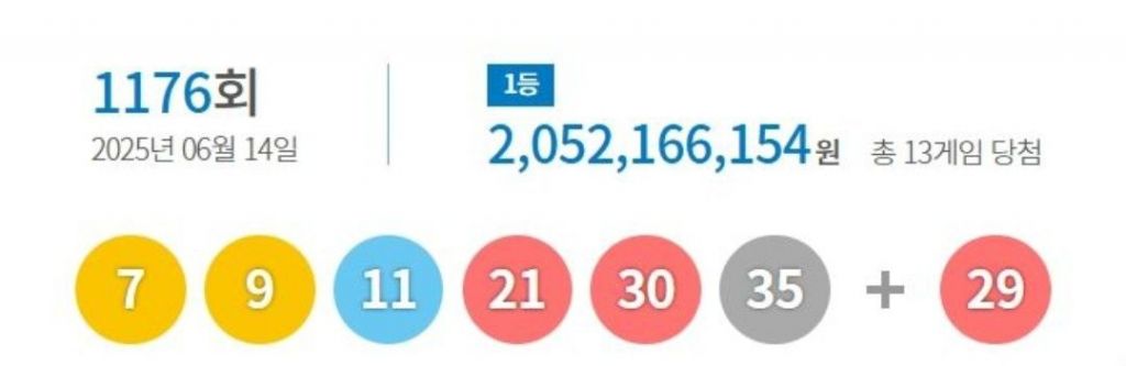 이번 동행복권 로또 1등 당첨번호는 '7, 9, 11, 21, 30, 35'이다. 2등 보너스 번호는 '29'이다. 당첨번호 6개를 모두 맞힌 1등 당첨자는 13명으로, 각각 20억5217만원씩 받는다. 1등 당첨자는 자동 선택 6명, 수동 7명이었다.