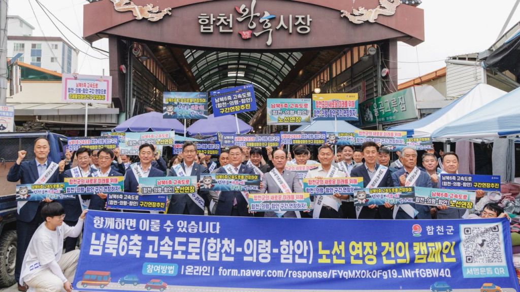 경남 합천군은 남북 6축 고속도로 합천·의령·함안 구간 연장을 위한 홍보 캠페인과 서명운동을 합천읍 장날에 맞춰 왕후시장 일원에서 진행했다고 16일 밝혔다.