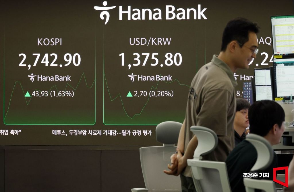 주가 5000시대를 열겠다고 공약한 이재명 후보가 대통령에 당선되면서 국내 증시가 2% 가까이 상승한 4일 서울 중구 하나은행 딜링룸 현황판에 코스피, 원/달러 환율, 코스닥 등이 표시되고 있다. 이날 코스피 지수는 전 거래일 대비 38.95포인트(1.44%) 오른 2,737.92에, 코스닥은 8.84포인트(1.19%) 오른 749.13에 개장했다. 2025.6.4 조용준 기자