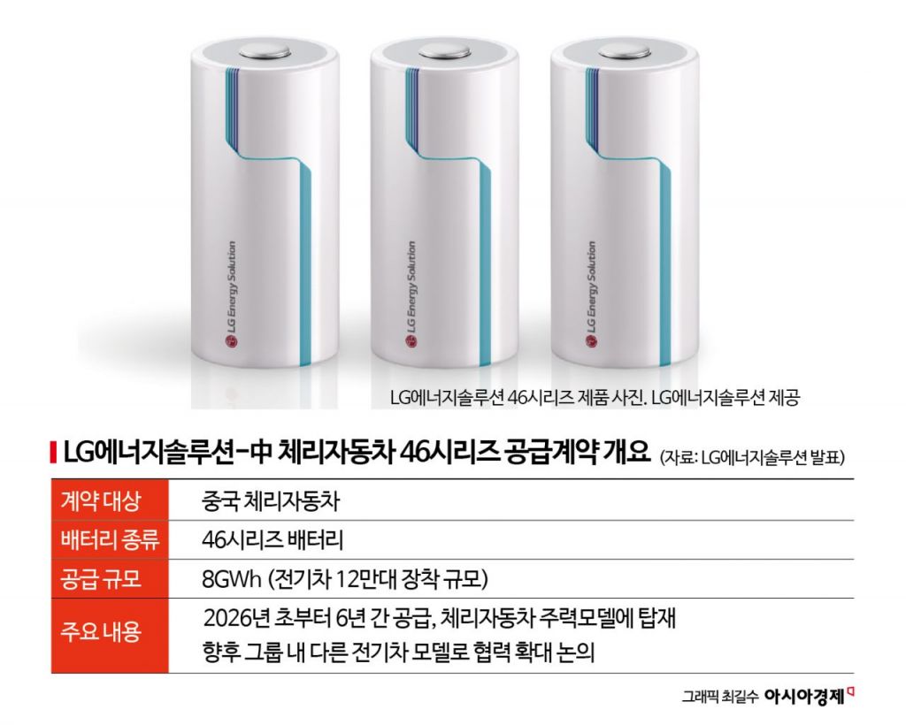 LG에너지솔루션은 16일 중국 5대 자동차업체인 체리자동차(奇瑞汽車)와 6년간 총 8GWh 규모로 46시리즈를 공급하는 내용의 계약을 체결했다고 밝혔다. 8GWh는 약 12만대의 전기차에 장착할 수 있는 수준으로, 업계는 약 1조원 규모에 달할 것으로 추정하고 있다. 내년 초부터 본격 공급을 시작할 예정이며, 체리자동차의 주력 모델에 탑재될 예정이다.