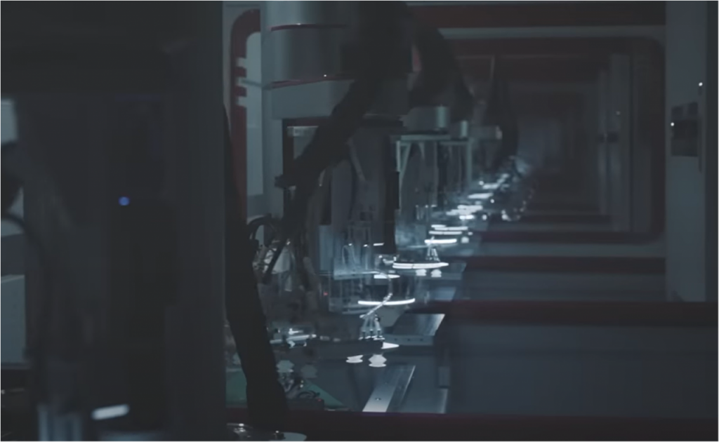샤오미가 구축한 다크 팩토리 내 생산라인. 조명이 꺼진 어둠 속에서 최첨단 센서를 통해 주변을 인식하는 다관절 로봇이 사람 대신 스마트폰 부품을 조립하고 있다. 샤오미 유튜브