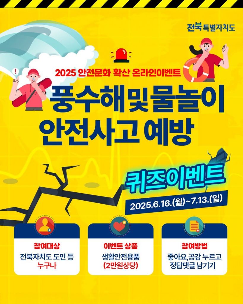전북특별자치도가 내달 13일까지 안전사고 예방과 도민 안전의식을 높이기 위해 풍수해 및 물놀이 안전과 관련한 온라인 퀴즈 이벤트를 실시한다.