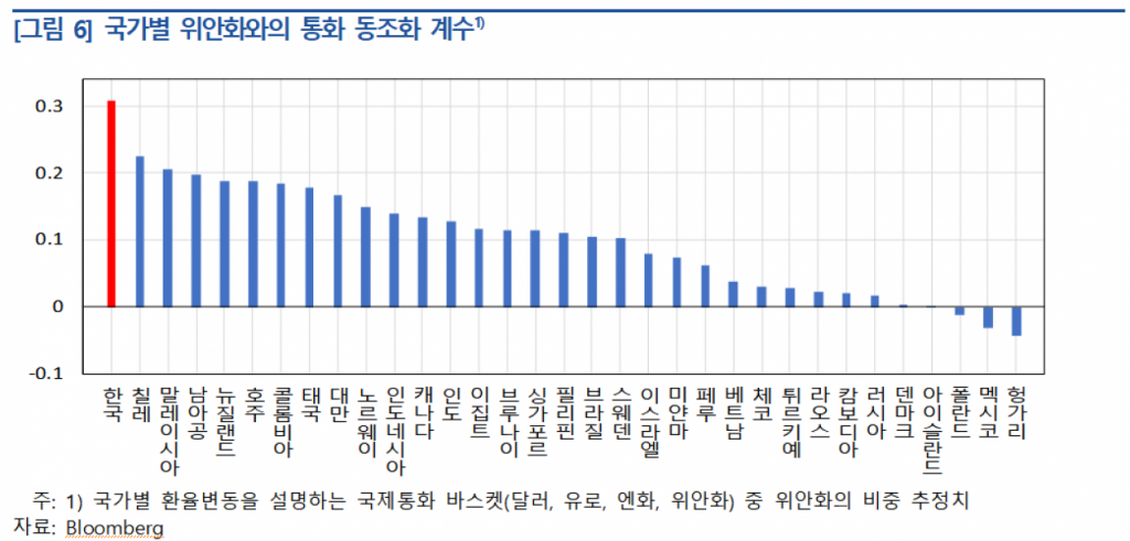 원화는 절하 국면에서 위안화와의 동조화가 강화되는 것으로 나타났다. 한국과 중국의 통화가 양국 경제의 높은 연계성 등에 따라 대체로 동조화를 보이는 것으로 알려졌으나, 절상 국면에서는 동조화가 약화하는 등 국면에 따른 비대칭성을 보인다는 진단이다.