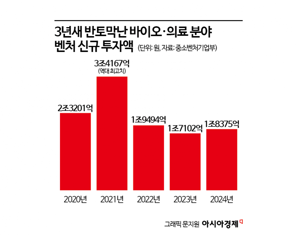 여기에 국내 경기 침체까지 겹치며 투자 심리가 얼어붙자, 2022년 하반기부터 벤처캐피탈(VC)의 신규 투자 건수가 급감했고 2023년 들어 그 추세가 뚜렷해졌다. 한 벤처투자 업계 관계자는 "고위험 업종으로 꼽히는 바이오 분야에는 새로운 민간 자금 유입이 사실상 끊겼다"고 토로했다.