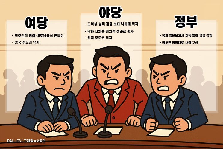 정부가 바뀌면 공수만 교대할 뿐 상황은 마찬가지다. 여야가 입장이 서로 바뀌어 '내로남불(내가 하면 로맨스, 남이 하면 불륜)'식 인사청문회가 반복된다. 윤석열 정부 당시 민주당은 정호영 보건복지부 장관 후보자가 자녀 의대 편입 과정에서 '아빠 찬스' 의혹을 집중적으로 때렸다. 문재인 정부 당시 자유한국당이 조국 후보자를 타격한 방식과 유사했다.