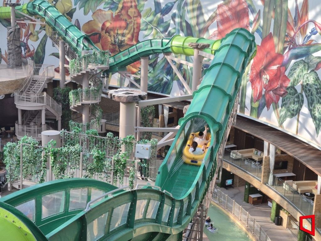 인스파이어 엔터테인먼트 리조트의 실내 워터파크 스플래시 베이에서 방문객들이 신규 시설 '아쿠아 레이서'를 탑승하고 있다. 김흥순 기자