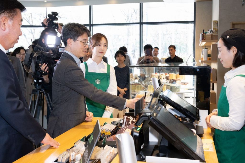 환경부, 맞춤형 일회용 컵 회수·보상을 위한 자발적 협약 체결 (서울=연합뉴스) 김완섭 환경부 장관이 10일 충북 청주시 스타벅스 청주 분평점에서 '맞춤형 일회용 컵 회수·보상을 위한 자발적 협약'을 체결한 후 일회용 컵 반납을 통한 에코별 포인트 적립을 체험하고 있다. 2025.4.10 [환경부 제공. 재판매 및 DB 금지] photo@yna.co.kr(끝)<저작권자(c) 연합뉴스, 무단 전재-재배포, AI 학습 및 활용 금지>