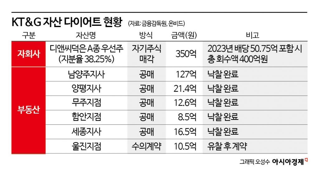 가 비핵심 자산 정리에 속도를 내고 있다. 지난해부터 최근까지 정리한 자산만 자회사 지분부터 지방 사옥, 알짜 핵심 부동산까지 다양하다. 2027년까지 100건 이상 자산을 매각해 약 1조원의 현금을 확보하고, 이를 전자담배와 건강기능식품 등 핵심 사업 투자와 주주환원 확대에 투입한다는 계획이다.
