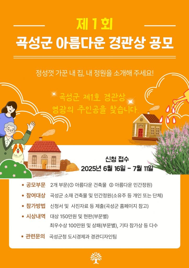 전남 곡성군(군수 조상래)은 주민들이 일상에서 정성껏 가꾼 아름다운 경관을 발굴하고 자발적인 경관관리 문화를 확산하기 위해 '제1회 곡성군 아름다운 경관상' 공모를 추진한다고 16일 밝혔다.