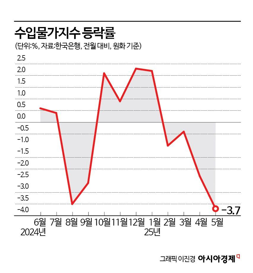 17일 한국은행이 발표한 '2025년 5월 수출입물가지수 및 무역지수(잠정)'에 따르면 지난달 수입 물가(원화 기준)는 전월 대비 3.7% 하락했다. 2023년 11월(-4.3%) 이후 1년6개월 만에 최대 하락률이다. 전년 동월 대비로도 5.0% 내렸다. 국제유가와 원·달러 환율이 모두 내리면서 원유 등 광산품을 중심으로 하락세를 나타냈다.