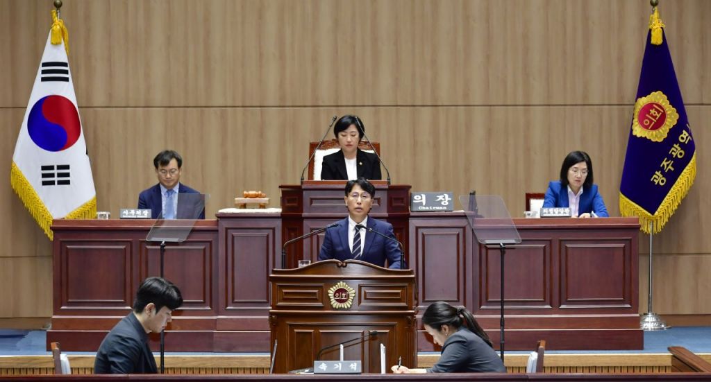 박필순 광주시의회 의원이 16일 제332회 1차 정례회 본회의에서 '긴급현안질문'을 하고 있다. 광주시의회 제공