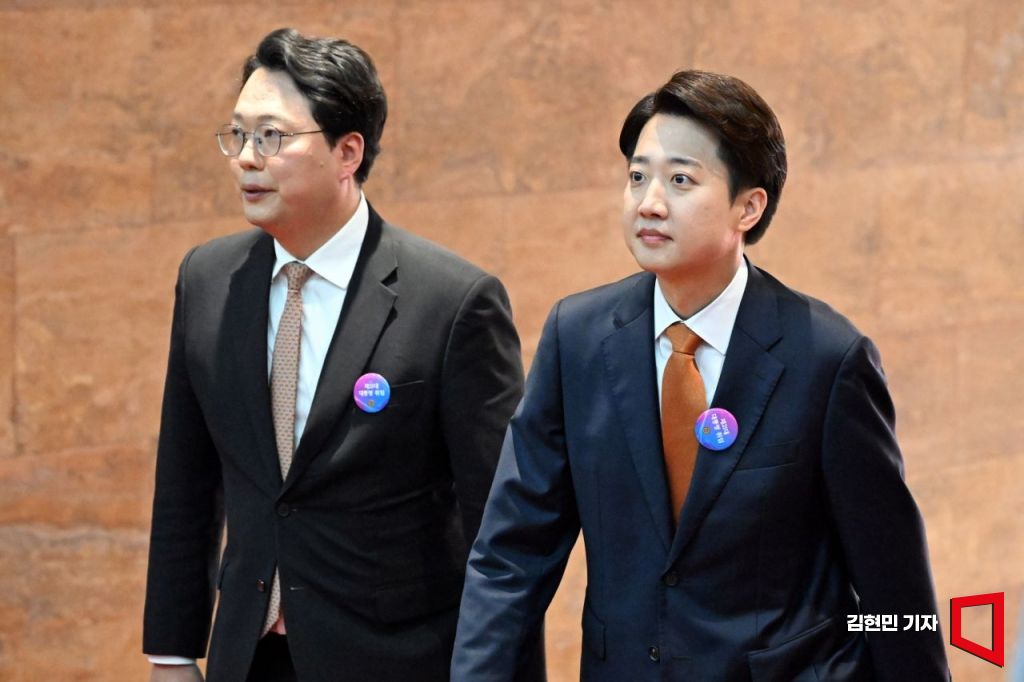 개혁신당 이준석 의원과 천하람 의원이 지난 4일 서울 여의도 국회에서 열린 제21대 대통령 취임선서에 참석하고 있다. 2025.6.4 김현민 기자