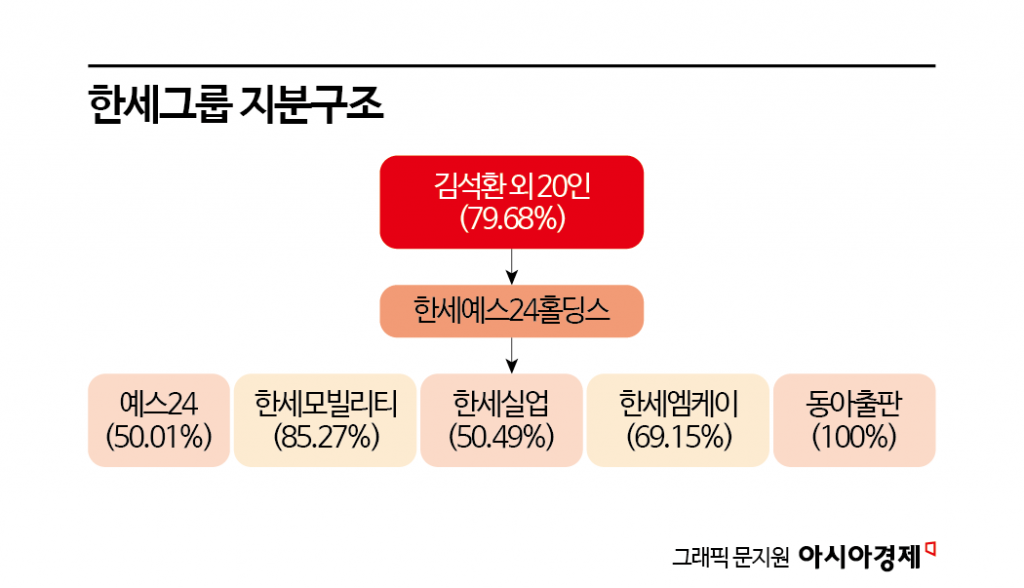 지주사인 한세예스24홀딩스는 예스24(50.01%), 한세모빌리티(85.27%), 한세실업(50.49%), 한세엠케이(69.15%), 동아출판(100%) 등의 지분을 보유하며 사실상 그룹 전체를 지배하고 있다.