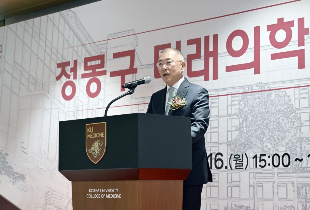 정의선 현대자동차그룹 회장이 16일 서울 성북구 고려대학교 메디사이언스파크에서 열린 '정몽구 미래의학관' 준공식에서 인사말을 하고 있다. 현대차그룹 제공