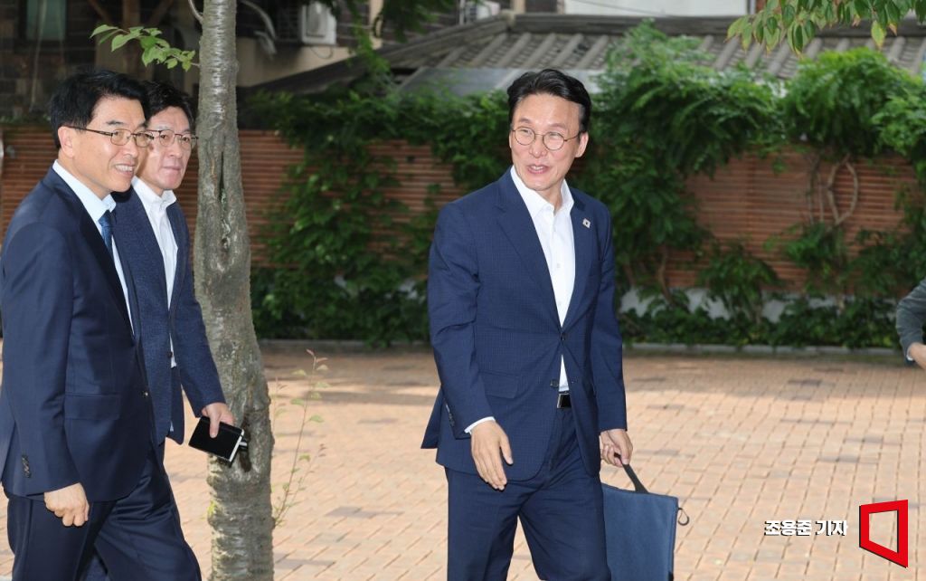 김민석 국무총리 후보자가 17일 서울 종로구 통의동 금융감독연수원에 마련된 청문회 준비단 사무실로 출근하고 있다.