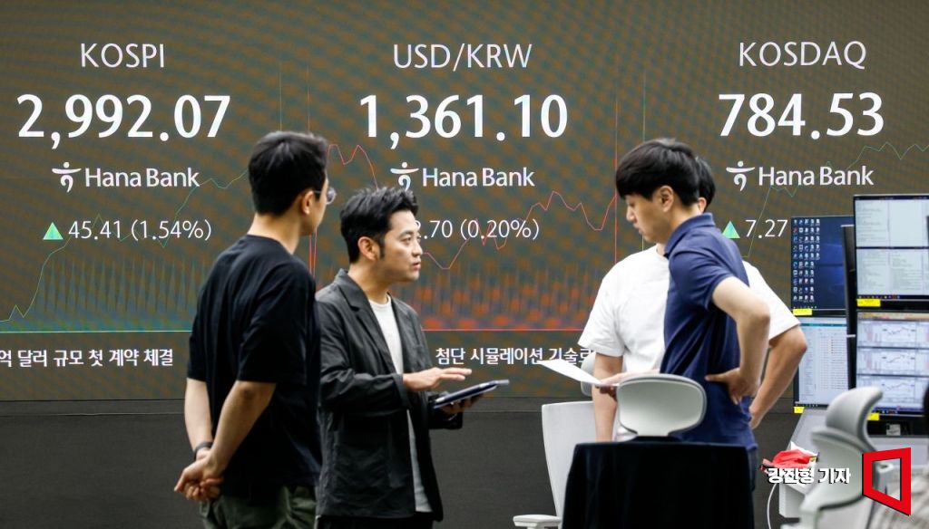 코스피 지수가 중동 위기 완환 기대감으로 상승세를 이어가고 있는 17일 서울 중구 하나은행 본점에서 딜러들이 업무를 보고 있다.