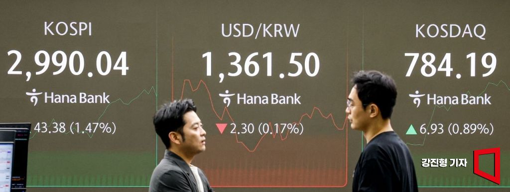 코스피 지수가 중동 위기 완환 기대감으로 상승세를 이어가고 있는 17일 서울 중구 하나은행 본점에서 딜러들이 업무를 보고 있다.