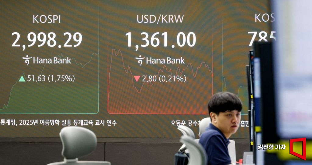 코스피 지수가 중동 위기 완환 기대감으로 상승세를 이어가고 있는 17일 서울 중구 하나은행 본점에서 딜러들이 업무를 보고 있다.