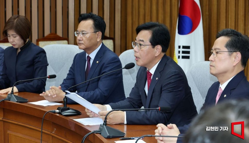 송언석 국민의힘 원내대표가 17일 국회에서 열린 원내대책회의에서 발언하고 있다.