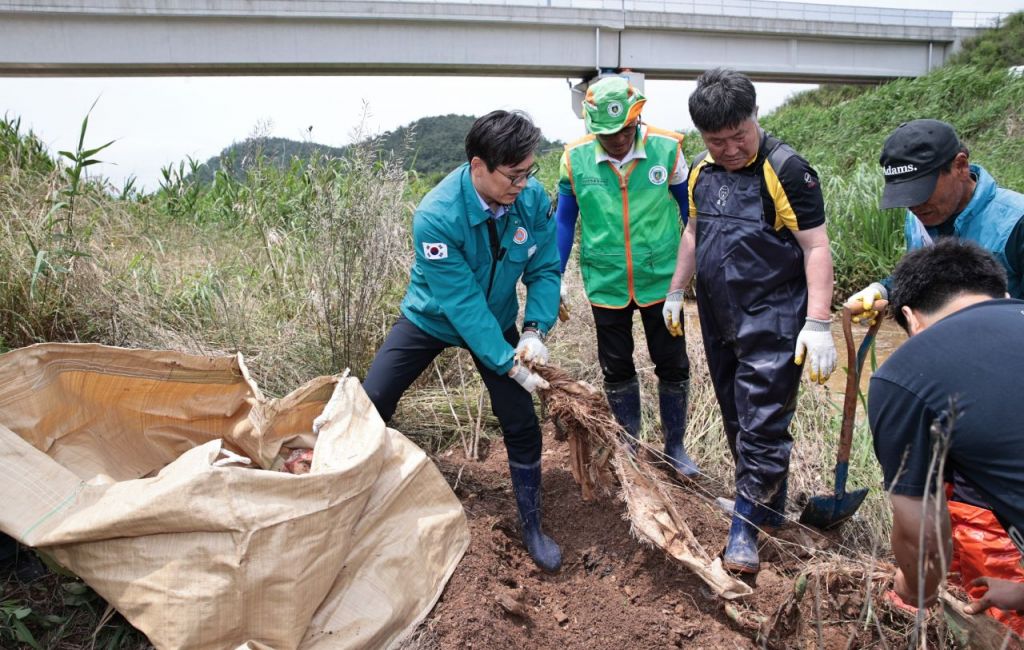 우승희 영암군수가 17일 여름철 우기를 맞아 주민들과 함께 영암군 미암면 춘동천 배수갑문에 쌓인 각종 쓰레기와 폐기물 치우기에 나섰다.