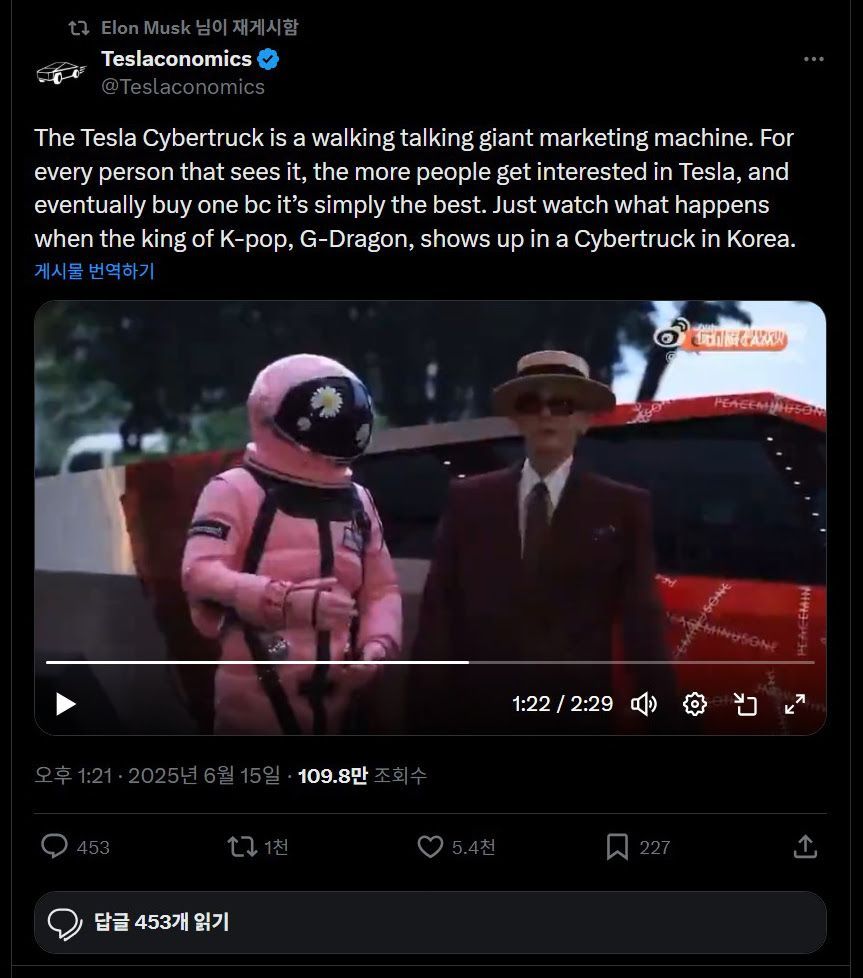 머스크가 테슬라 사이버트럭 탄 GD 영상을 리트윗 했다. 갤럭시코퍼레이션