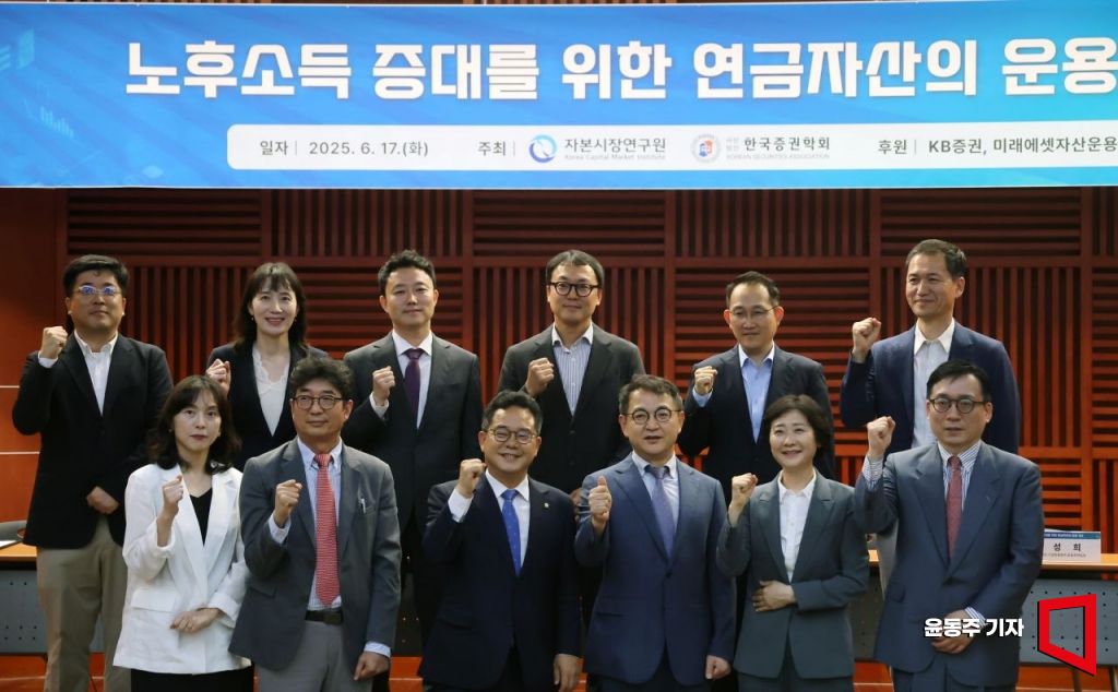 17일 서울 여의도 금투협회에서 열린 '노후소득 증대를 위한 연금자산의 운용 개선' 세미나에 참석한 민병덕 더불어민주당 의원(아래줄 왼쪽 3번쨰부터)과 전진규 한국증권학회 회장, 김세완 자본시장연구원장(아래줄 오른쪽) 등 주요 참석자들이 기념촬영을 하고 있다.